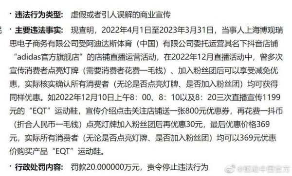 【#adidas抖音运营方虚假宣传被罚20万##阿迪抖音店铺运营商虚假宣传被罚#】