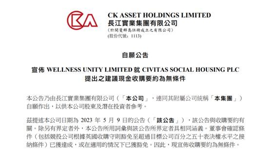 长江实业于2023年5月9日提出以现金每股80便士全面收购Civitas Social Housing PLC,较2023年5月5日每股收市价55.4便士高出44.4%,并获得Civitas Social Housing PLC董事会推荐。本次全面收购的总代价约为4亿8500万英镑(相当于港元约48亿1100万元)。