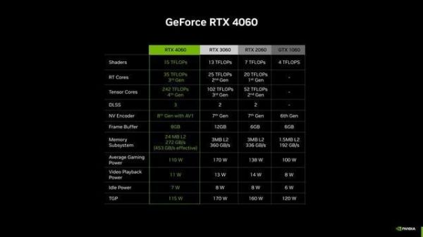 就功耗方面而言,RTX 4060的平均游戏功耗为110W,相比之下,RTX 3060的功耗为170W,RTX 2060的功耗为138W。这意味着RTX 4060具有更高的能效,能够在较低的功耗下提供出色的游戏性能。
