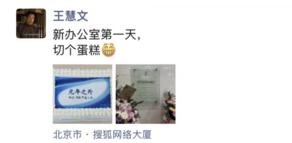4 月 6 日,在搜狐网络大厦,光年之外正式开张。王慧文发朋友圈表示:新办公室的第一天