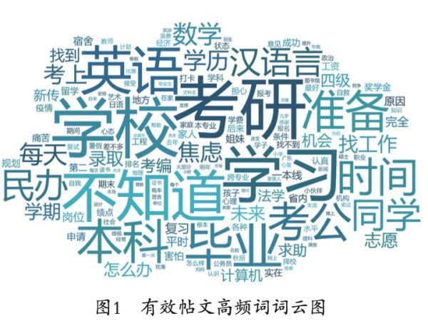 为了整体把握帖文涉及的主题及内容,研究者首先对帖文文本进行了高频词分析,并绘制词云图(见图1)。然后对全部帖文进行仔细阅读,筛选出与本研究高度相关的帖文。因为帖文量很大,涉及每一个主题的相似帖文都有很多,研究者优先选取相似主题帖文中包含更多性别、专业、地区等发帖者背景信息的帖文,最终筛选出28篇。
