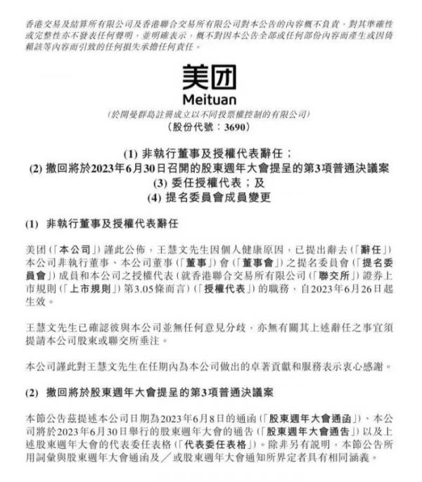 美团6月25日晚间发布公告称,美团联合创始人王慧文因“个人健康原因”申请辞去美团董事。