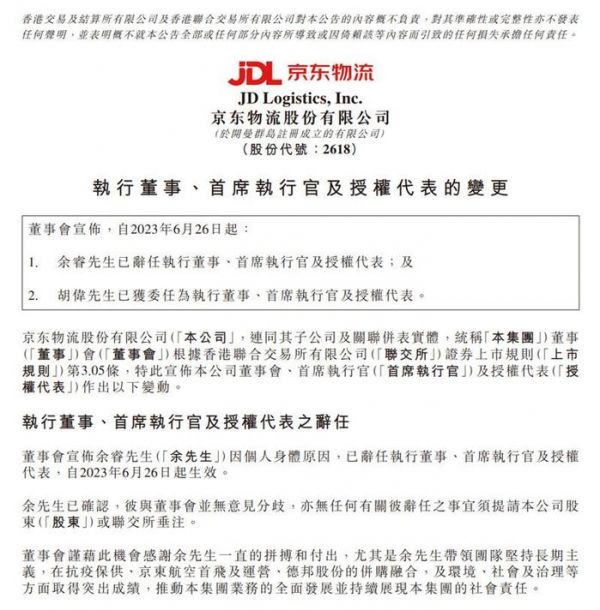 6月26日,京东物流发布公告称,京东物流CEO余睿因个人身体原因辞任执行董事,由首席执行官及授权代表,原京东产发CEO胡伟接任京东物流CEO。