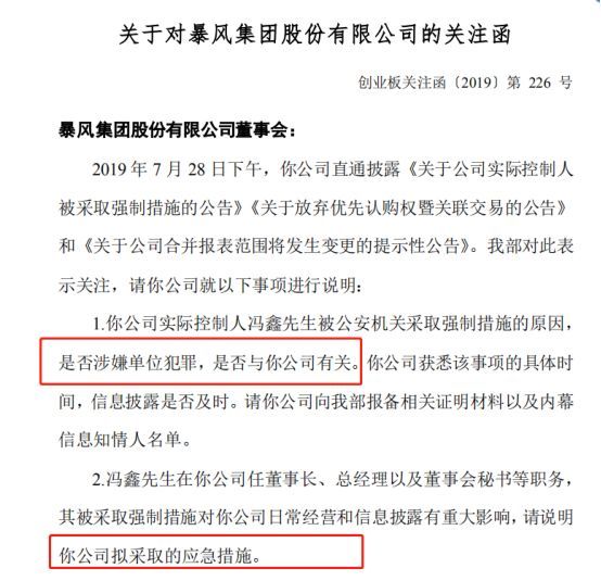 消息面上,7月29日晚,深交所向暴风集团下发关注函,要求其说明公司实际控制人冯鑫被公安机关采取强制措施的原因,以及是否涉嫌单位犯罪、是否与公司有关、是否会对公司日常经营和信息披露有重大影响等诸多问题。同时要求暴风集团说明公司获悉该事项的具体时间,信息披露是否及时。