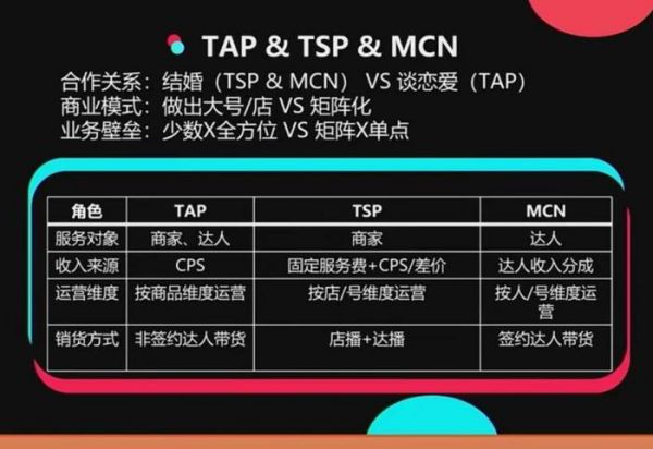 除此之外,还有一种同时服务于商家和达人侧的“TAP”模式。这种模式下只是按照商品的点击收费,不用与机构签约。对比TSP和MCN的“强绑定”关系,TAP显然是一种“弱关联”。在行业内部,两者之间的区别通常被比喻为“结婚”与“恋爱”的差异。