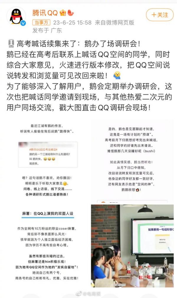 #喊话腾讯考生恢复老版QQ空间# 高考生喊话马化腾后续:腾讯 QQ 空间已改回老版,说说转发和浏览量恢复可见。有效喊话,主打一个高效率![666]#QQ空间恢复转发和浏览量#