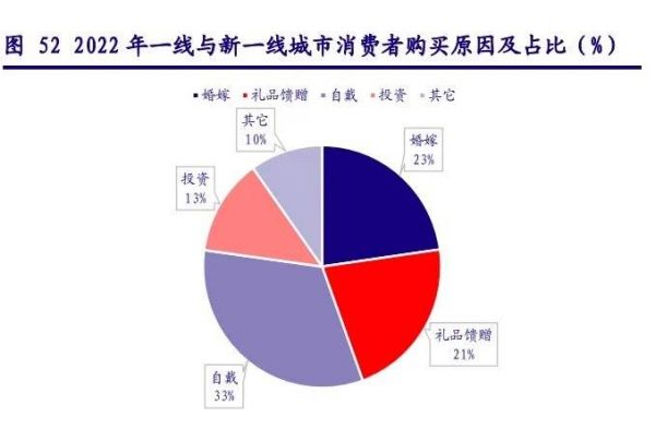 中国银河证券发布的《黄金珠宝行业研究》也显示,一线与新一线城市黄金首饰购买需求同其它各层级城市的需求呈现差异化趋势,通过对比,一线与新一线城市黄金首饰购买需求中,泛婚嫁需求所占比例远低于其它各线城市。可见,自戴需求超越婚嫁需求,更多的是出现在一线及新一线城市。