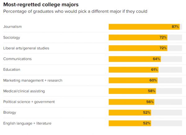 美国大学生“后悔”专业排行榜:新闻第一,教育、市场营销也在前十