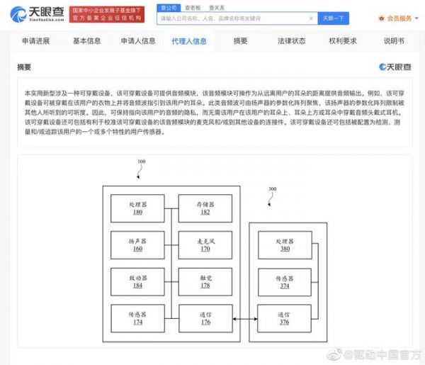 6月26日消息,天眼查App显示,近日,苹果公司申请的“可穿戴设备”专利获授权。摘要显示,该实用新型专利中可穿戴设备可提供音频模块,可在用户耳朵远距离处提供音频输出。例如,该设备可被穿戴在用户的衣物上,将音频波指引到用户的耳朵。此类音频波由扬声器的参数化阵列聚焦,可限制被其他人听到。因此,能保持用户音频的隐私,而无需在耳朵上方或耳朵中穿戴耳机。该可穿戴设备有利于校准音频模块的麦克风和/或到其他设备的连接件,还可包括被配置为检测、测量或追踪该用户的一个或多个特性的用户传感器。