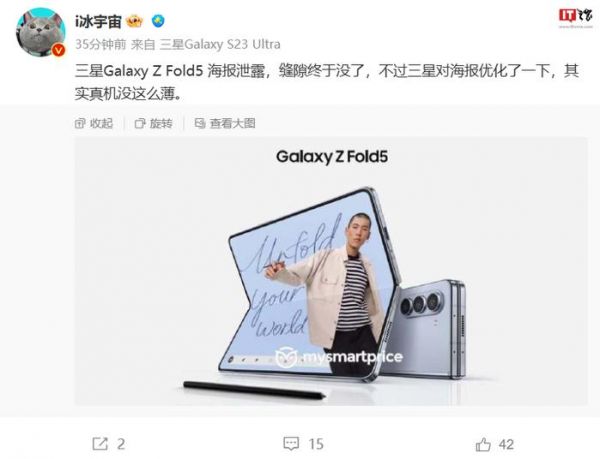 不过,博主 @i 冰宇宙 表示,这张海报有一些“美颜”部分,真机没有这么薄。根据此前爆料,三星 Galaxy Z Fold5 用上了水滴铰链技术,与传统铰链相比,水滴铰链不仅可以实现屏幕的无缝折叠,并且提供了更柔和的折叠曲线,从而缓解屏幕的折痕问题。
