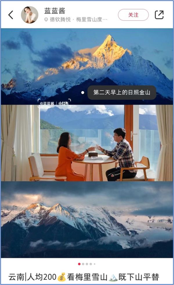 △在酒店阳台看雪山,比观景台上的风景更好。/小红书截图