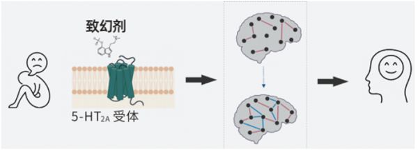 有研究表明致幻剂进入大脑后,能引起树突棘密度持续增加,使神经信号传递效率大幅提升;处于精神疾病状态的大脑各区域往往协调性下降,而致幻剂通过增加大脑功能整体性,使其“齐心协力”,从而达到治疗效果。