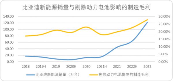 那么如果我们要还原制造毛利率和销量的关系,就不得不剔除动力电池这个外在最大成本要素的影响。