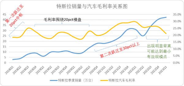 如果我们把特斯拉的销量和汽车毛利率放在一张表中,可以得出下面这张图。