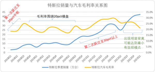 介于比亚迪半年披露一次汽车利润率,2023年半年报还未发布,我们还是以特斯拉为例,在2022年Q2之后,汽车毛利率和销量出现了明显的背离。