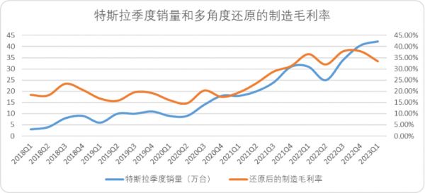 图:特斯拉销量与多角度还原制造毛利率关系,来源:锦缎研究院