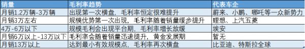 规模经济的跃迁始于单季度3万辆和半年15万辆的区间,也就是月销1~1.2万辆以上的新能源车品牌,会随着销量提升出现明显的制造毛利增长。