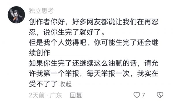 但是不可否认的是,“油腻男”本身是丑的。方头明们所演绎的油腻男,我更愿称之为猥琐。大部分女性都经历过这种让人不适的潜在性骚扰的行为和动作,所以极易产生共鸣。只是没想到到了短视频时代本该被弃若敝履的审丑文化,却长盛不衰成为流量密码。虽然说博主意在让油腻男成为笑料,帮助女性抚慰恐惧和耻感,但长期消遣和麻木过程中,人们很容易模糊美丑边界,从最开始的不适到后面的“集体无意识”,只会让更多“丑角”逐利起舞,深陷在审丑异化的泥沼之中无法自拔。