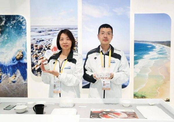2019年11月8日,在第二次参加进博会的日本伊藤忠商事会社展台,工作人员李莉(左)与邓俊在展示用于生产“塑料替代制品”的原材料 丁汀摄/本刊