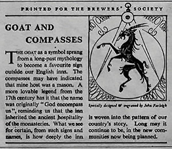 山羊和指南针 西方作家们对“山羊和指南针”的含义有多种解读。有一个从17世纪开始广为流传的说法,“Goat and Compasses”来自于“God encompass us”的谐音,山羊和指南针经常作为英国一些旅馆的招牌。