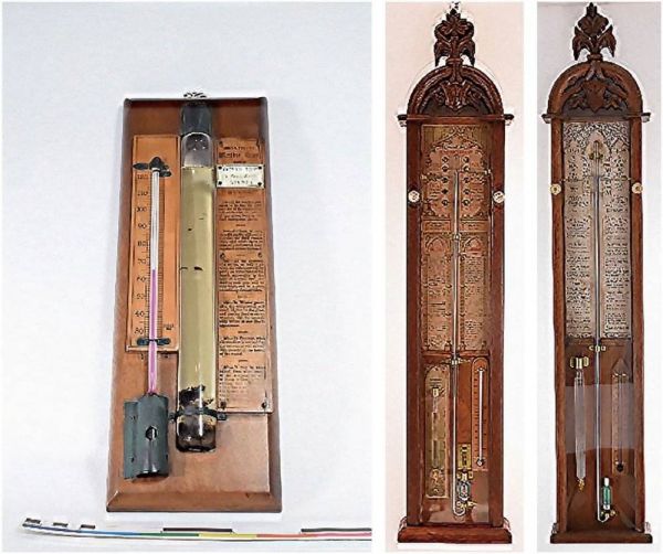 菲茨罗伊气压表 左图为英国科学史博物馆(History of Science Museum)收藏的伦敦19世纪中叶的菲茨罗伊天气瓶(Admiral FitzRoy Weather Glass),由沃森兄弟(Watson Brothers)提供;中、右图为晴雨表世界(Barometer World)售卖的古董晴雨表。