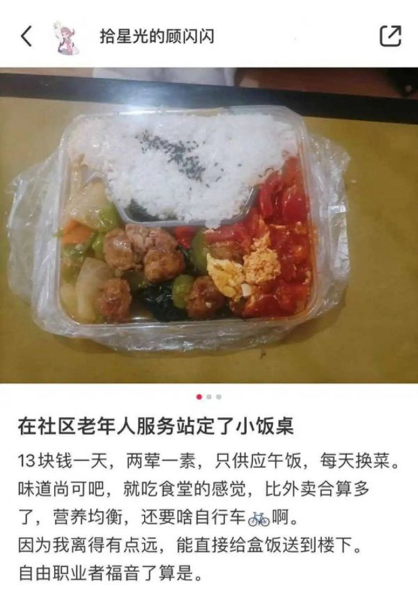 自从在小某书上发了自己订的成人小饭桌,不少人都来向顾闪闪咨询自己能不能吃到,“我才发现附近有好几个这样的幸福食堂配餐点,辐射范围很广。”