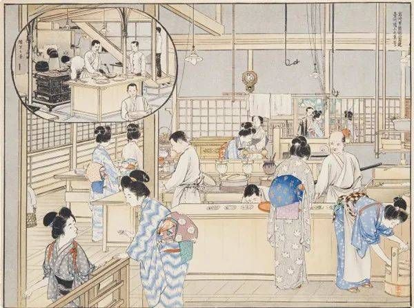 村井弦斎作品《食道乐》夏季卷的插图中,描绘了日本企业家岩崎弥之助的厨房。图中不仅有底层的西餐厨房,楼上的日式厨房也是立式工作的