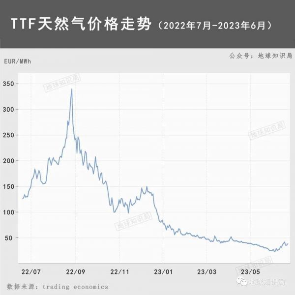 随着各种政策变动,天然气价格呈现了火箭式冲高和近几个月的“大萧条”式波动。据Trading Economics统计,天然气荷兰TTF价格已从2022年8月底的338.01EUR/MWh跌到今年6月的30EUR/MWh。