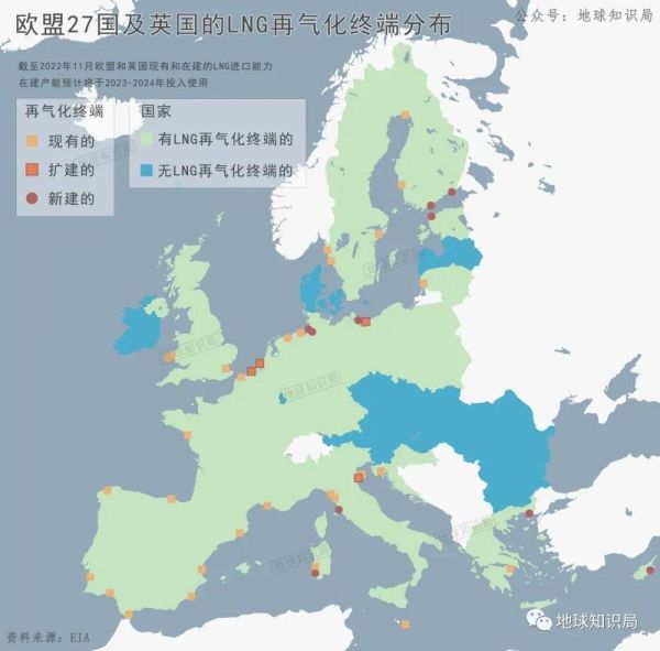 欧盟27国及英国的LNG再气化终端分布示意