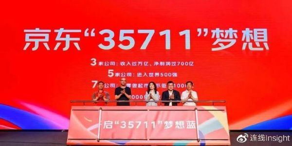 据内部信,“35711”梦想为:京东能有3家收入过万亿人民币、净利润过700亿人民币的公司;5家进入世界五百强的公司;7家从零做起市值不低于1000亿人民币的上市公司;能为国家缴纳1000亿人民币税收;提供超过100万就业岗位。