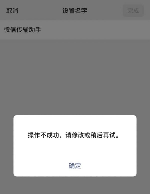 当把自己的微信昵称改为“文件传输助手”时,系统马上进行了干预:“操作不成功,请修改或稍后再试。”