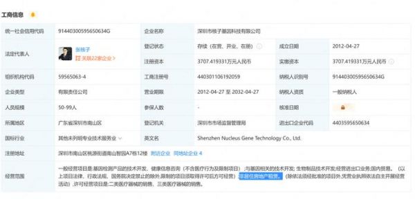 公开信息显示,近日深圳市核子基因科技有限公司发生工商变更,企业经营范围中新增了“非居住房地产租赁业务”。