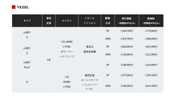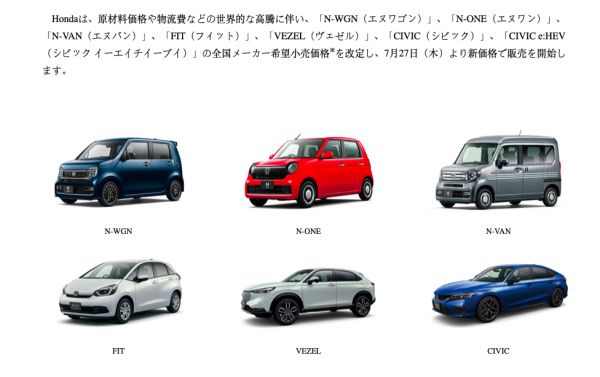 其中,飞度的涨幅在31900日元-70400日元(折合人民币1600元-3540元)之间。思域则是40,000日元-50,000日元(折合人民币2000-2500元)。涨价幅度最高的是Veze(国内的缤智),达到了119,900日元(约6000元人民币)。