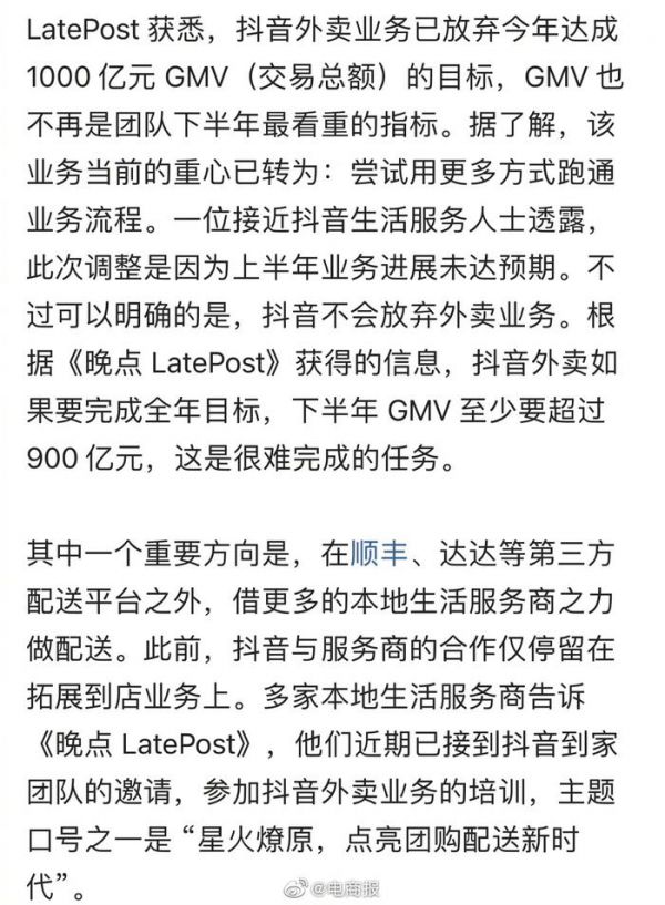 抖音外卖又折了?放弃千亿GMV目标,跑通业务成首要任务