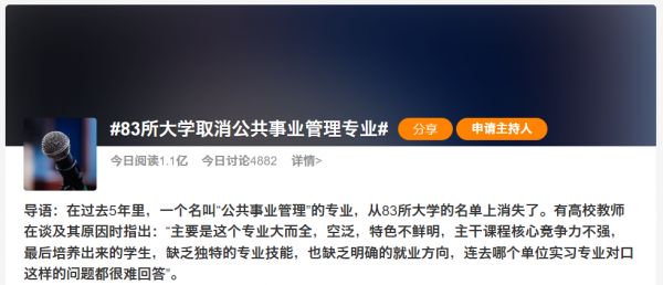 还有公共事业管理,也是20年前的热门专业,但如今已经成了鸡肋。去年,该专业5年内被83所高校取消的新闻,甚至还上了热搜。