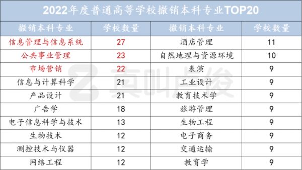 排名前三的专业中,有2个都是20年前的专业,近十年被大量撤销。说实话,这些专业已经比很多00后的年龄还要大了。比如信息管理与信息系统专业,在1998年由教育部设立,到去年,就有27所高校取消了该专业点。