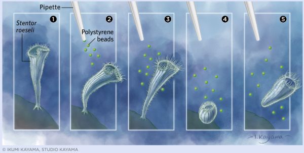 继Herbert Spencer Jennings在 20 世纪初进行的实验之后,哈佛医学院的研究人员最近在原生动物 喇叭虫身上观测到了一种可称为“行为递进”(behavioral hierarchy)的适应模式。他们每隔几分钟就向载玻片上沉积的喇叭虫发射一束束聚苯乙烯颗粒,刺激载玻片上的细胞(见①)。正如Jennings记录的那样,他们发现,喇叭虫的行为会根据之前发生的事情而变化。起初,它的反应是弯身远离聚苯乙烯颗粒 (见②)或挥动纤毛(见③)。但过了一会儿,它们采取了更夸张的做法——收缩(见④),或干脆游走(见⑤)。研究人员在他们的论文中称,这一系列行为虽然不算是复杂的学习形式,但能表明喇叭虫在做决定时确实会参考以前的经验。