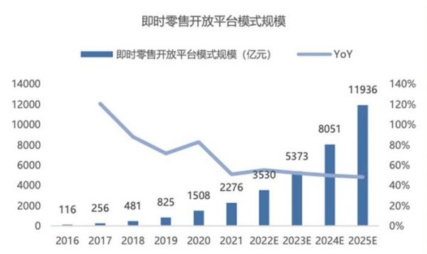 根据国金证券的这份图表可以看到,经历了2020年和更早期的爆发期,从2022年起,即时电商已经进入了平稳增长期,预计到2025年,平均增幅大约为50%左右。