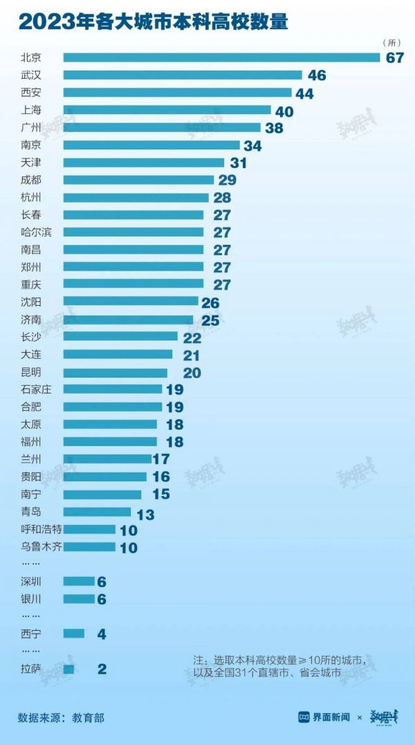 据教育部最新公布的全国高等学校名单,截至2023年6月15日,全国共有普通高等学校2820所,其中本科院校1275所。分城市来看,北京的本科院校最多,有67所。其次是武汉、西安,本科院校数量均超40所。