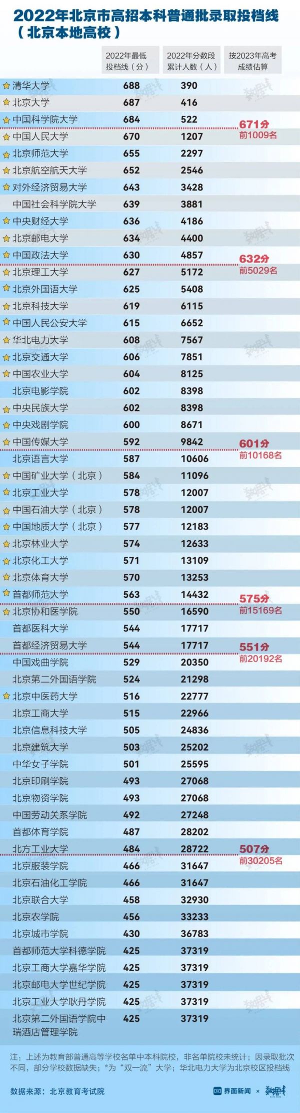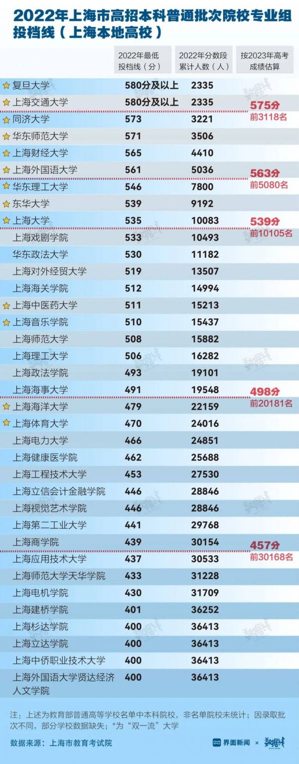 界面数据整理了北京、上海两城2022年本地高校的最低投档线与对应排名,并与2023年高考成绩排名分布进行了对比。鉴于各高校对不同专业会有选科要求,分数线仅供参考。