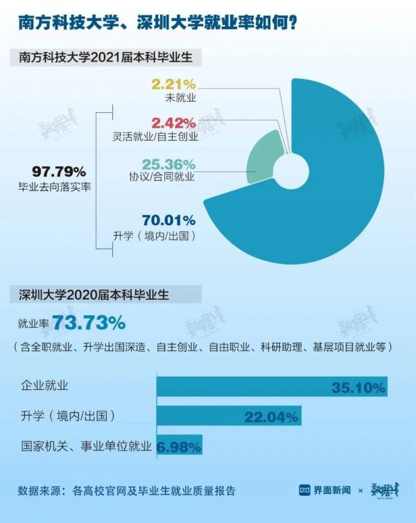 从“双一流”高校南方科技大学就业率来看,该校2021届本科毕业生有7成选择升学,合同就业、灵活就业等毕业生占比不到3成。另一所进入“2023软科中国大学排名”百强的深圳大学就业情况更为乐观,该校2020届本科毕业生有超4成进入企、事业单位工作。