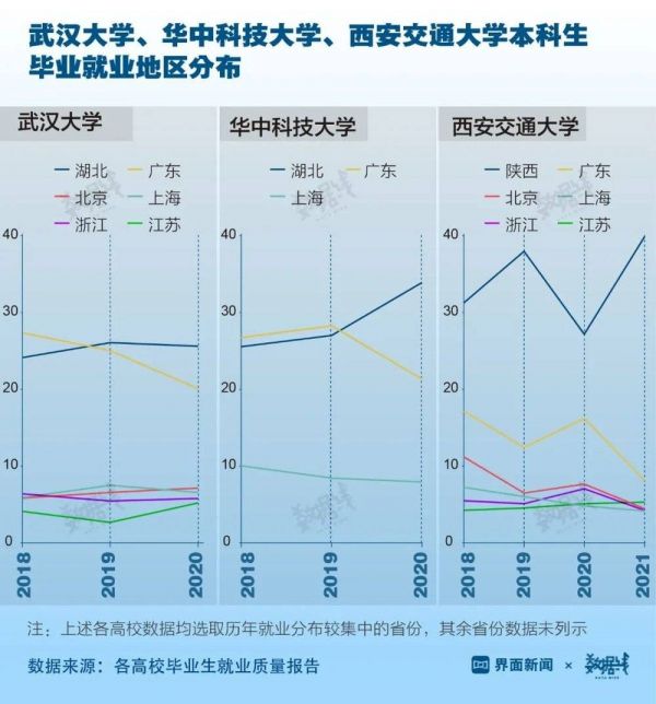 另一方面,武汉、西安两城目前本科院校数量已经超过上海、广州,仅次于北京。这些城市的高校毕业生选择留在当地工作的越来越多。界面数据选取“2023软科中国大学排名”前十强高校中,位于武汉、西安两城的3所高校就业数据进行了分析。