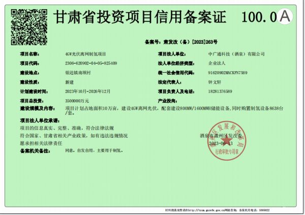 但是,《每日经济新闻》记者在调查中发现,肃州区人民政府网站可以查询到4GW光伏离网制氢项目备案证,并盖有肃州区发展和改革局行政审批专用章。在备案机关备注一栏标注:“同意。自发自用,主要用于制氢”。