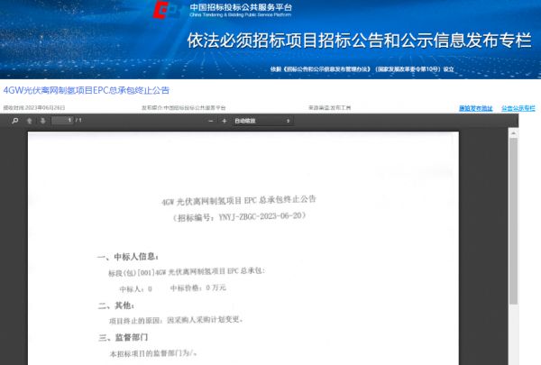 然而仅仅6天后,《每日经济新闻》记者在该平台发现,这个项目已经终止。6月26日,中国招标投标公共服务平台发布《4GW光伏离网制氢项目EPC总承包终止公告》。公告显示项目终止的原因是“因采购人采购计划变更”。