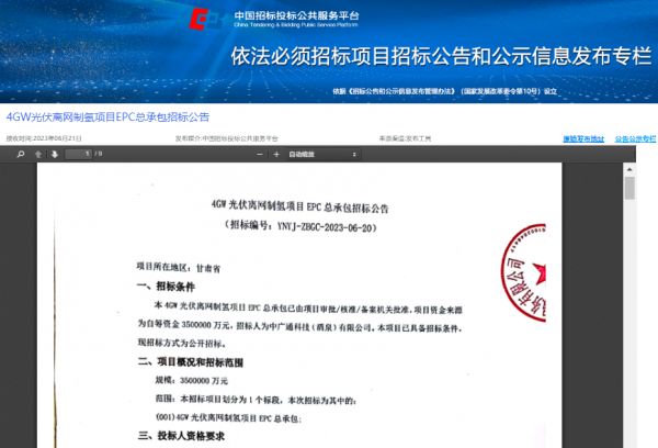 据中国招标投标公共服务平台,6月21日,中广通科技(酒泉)有限公司发布了4GW光伏离网制氢项目EPC总承包招标公告。
