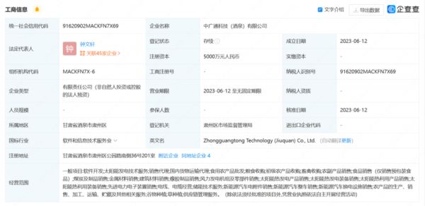 企查查显示,中广通酒泉是国家电力投资集团有限公司的六级子公司。记者拨通中广通酒泉上属公司中广通新能源集团有限公司的联系电话,对方告知记者,“那(中广通酒泉)是我们的下属公司,我们新成立的一个公司”。