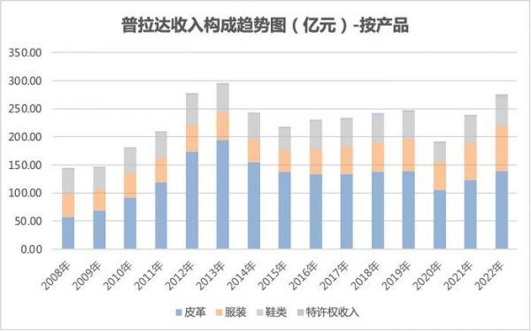 业绩波动的同时,Prada业务构成从曾经包包、服装、鞋子大致上三分天下的排布,逐渐发展为今天2.7:1:1的业务体量对比。如果和2008年数据相比,Prada旗下的皮革用品、服装和鞋类的营业收入,分别增长了145.52%、92.57%和18.24%。以包包为代表的皮具用品已然成为Prada最重要的业务板块。