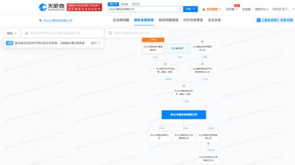 天眼查App显示,乐山大佛实业有限公司成立于1999年6月,注册资本2亿元,经营范围包括餐饮服务、游艺娱乐活动、住宿服务、游览景区管理等。股权全景穿透图显示,该公司由乐山大佛旅游投资开发(集团)有限公司全资持股,后者控股股东为乐山国有资产投资运营(集团)有限公司。