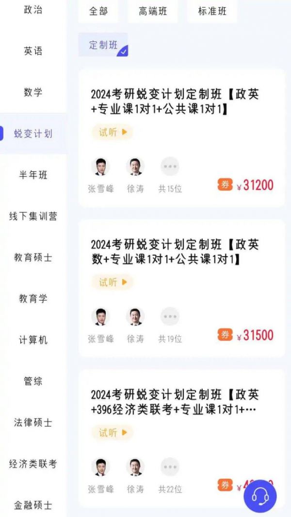 在天猫淘宝上,张雪峰报考类的书,单价多在30元-70元左右,销售量多在1000+,另外还包括张雪峰团队的私人定制择校服务498元;峰学蔚来APP也曾上架过价格8999元的“峰学志愿梦想卡”;在研途考研APP中,蜕变计划里有关张雪峰的课程,价格超30000元。