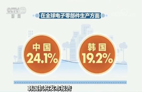 在全球电子零部件生产方面,中国占24.1%,依然位列第一,韩国占19.2%,紧随其后。